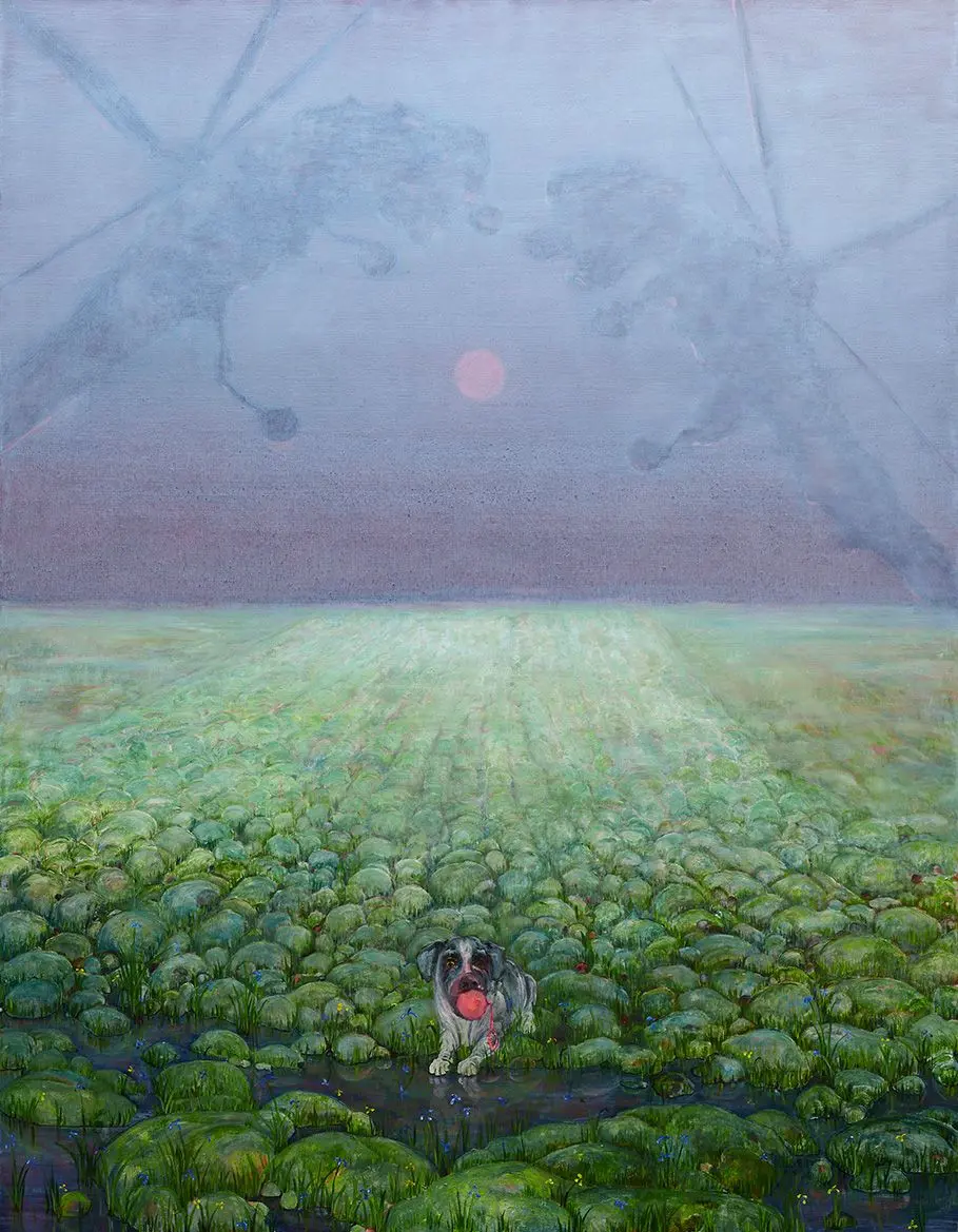 Il “verde che brucia” può essere un riferimento al paesaggio, alla crisi ambientale e allo sfruttamento aggressivo del territorio, così come agli elementi che rimandano alla sfera militare presenti in alcuni dei nuovi lavori o alle tracce di colori fluorescenti che connotano le opere dell’artista.