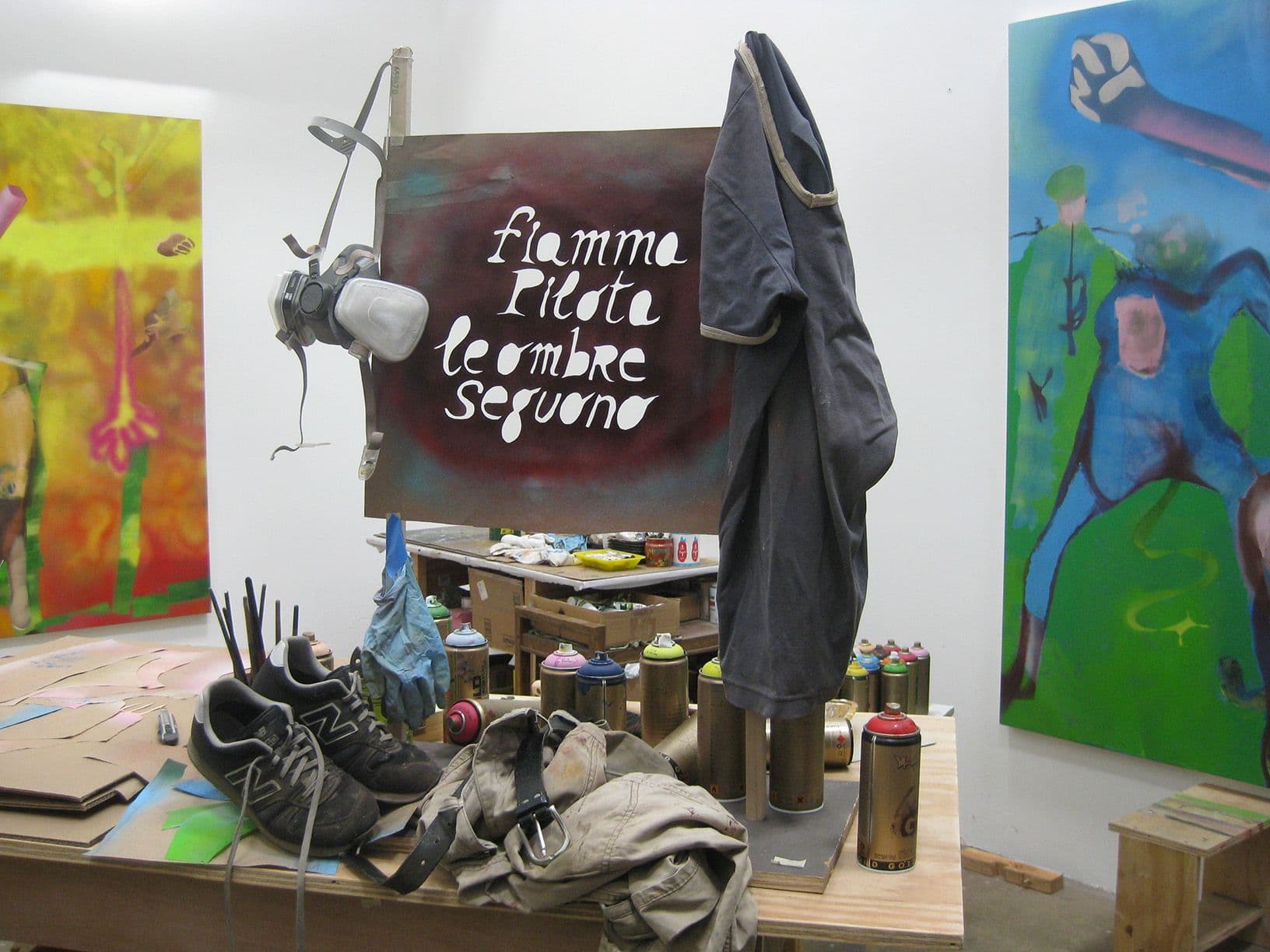 As for his method, Pessoli’s work is constructed using a free mix of techniques and styles: the artisanal, manual quality of collage and spray paint applied over stencils is fused with the more traditional pictorial gesture, becoming an integral part of it.