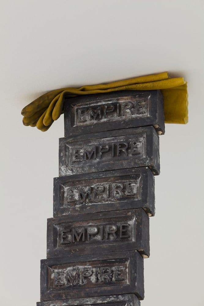 An industrial steam presser, carpets wedged into a brick wall, a slanted pillar proudly exhibiting its trademark: these devices ironically summarise the contradictions of history, its slippages and, at times, the total collapse of the meanings it had imposed on names and things. But the instability, the enigmas that these works propose do not have anything vague or evocative. Instead, they address something that sounds all too familiar: the loss of trust in the promises of technique, the posthumous world emerging after the failure of ideologies and their supposed remedies; the surrendering of forces squandering memories and communities and making them feral again.