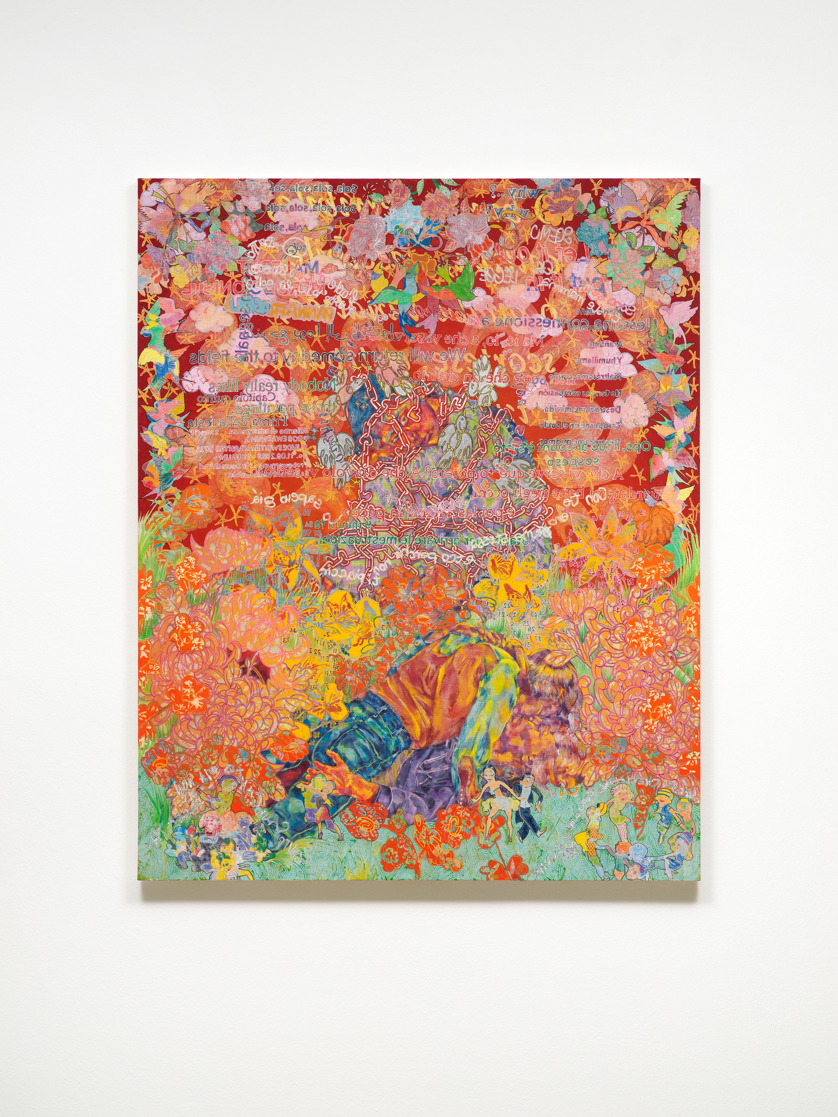 Branconi’s rich, uncontainable mode of painting is characterized by a compelling visual density. It swarms across both front and back of the thin fabrics she uses as a support, multiplying the expressive possibilities and levels of interpretation.