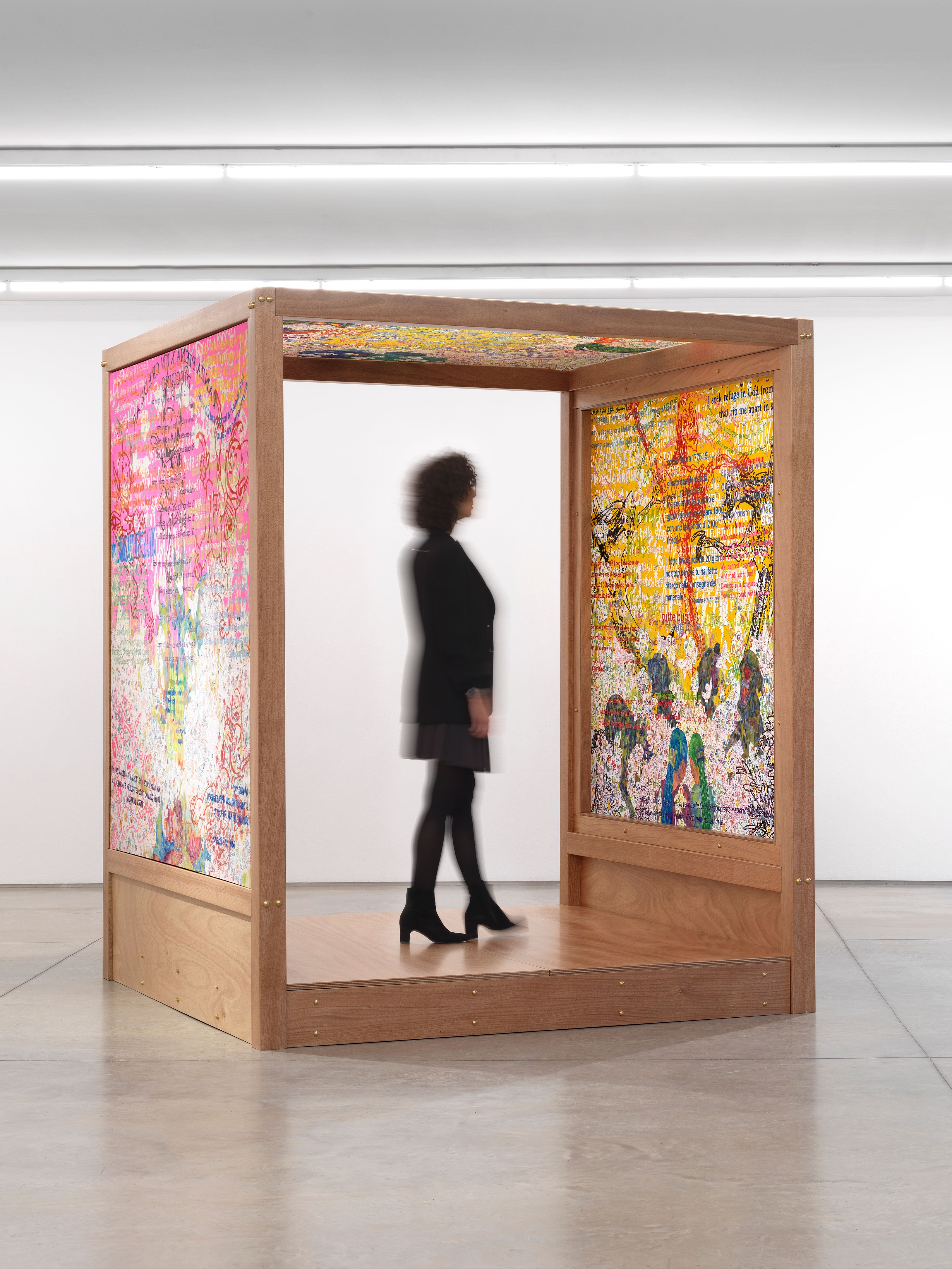 For this exhibition, Branconi has chosen to focus on text as a central element, turning it into a pervasive, explosive presence that unfolds through myriad languages, alphabets and fonts: an inner diary of fragments in which to wander or try to trace new connections.