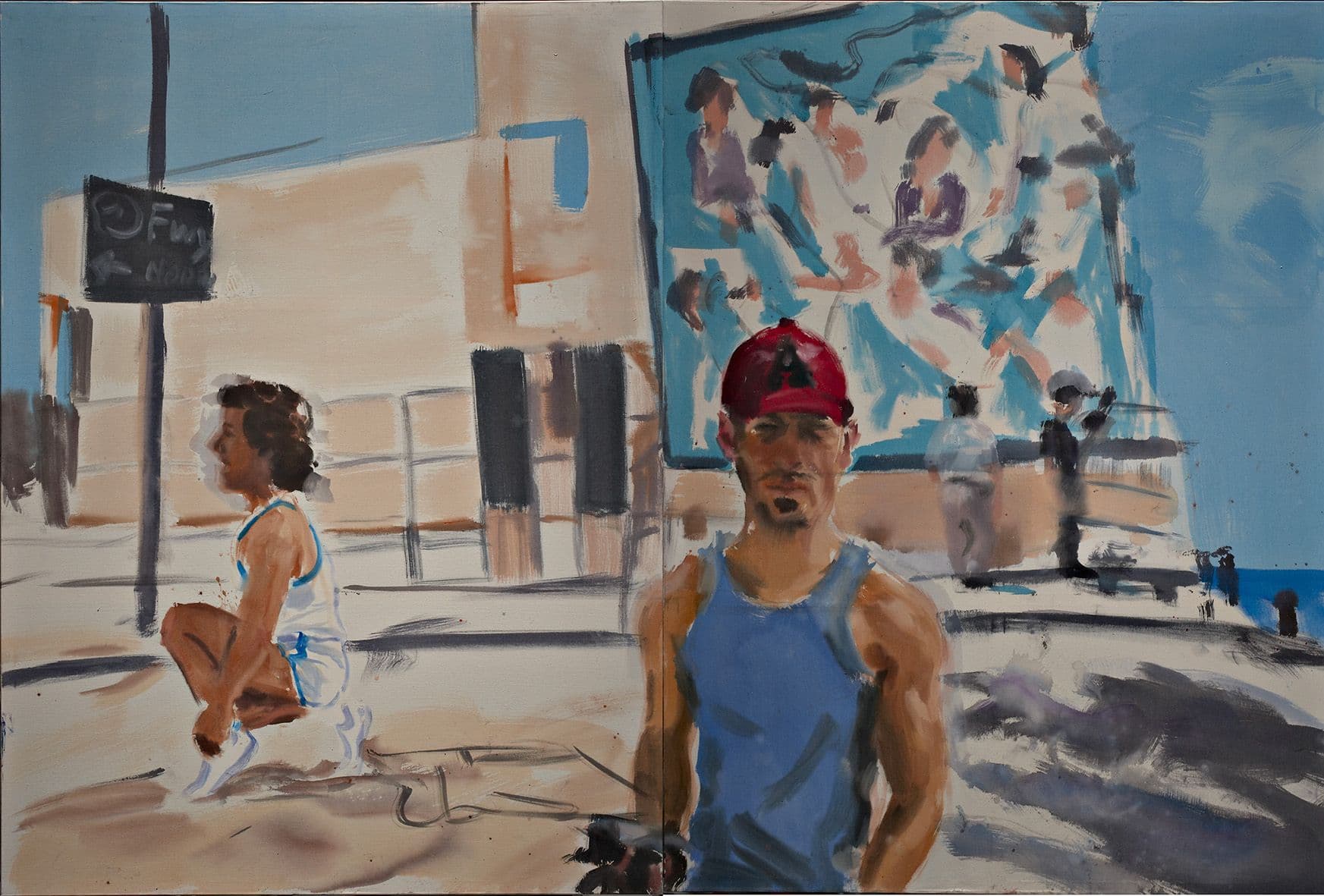 Dietmar Lutz's paintings are pervaded by a strong narrative structure and are often inhabited by male characters, the protagonists of a story drawing its inspiration from cinema, photographs or sketches in travel journals. The bodies and places being depicted are defined by an extremely essential style composed of wide and fast brush strokes instilling a feeling of extreme clarity and immediacy of meaning in viewers.