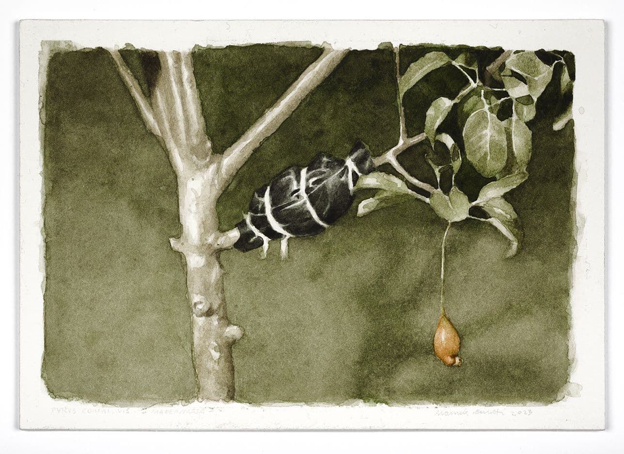 A recurring image in the exhibition is a piece of black plastic landscape fabric knotted around the leg of the human figure who appears in the works. Almost a natural extension of his body, this binding alludes to marcotting, or layering: a technique that creates new plants by encouraging root growth at some point in the stem or branch of the original one.