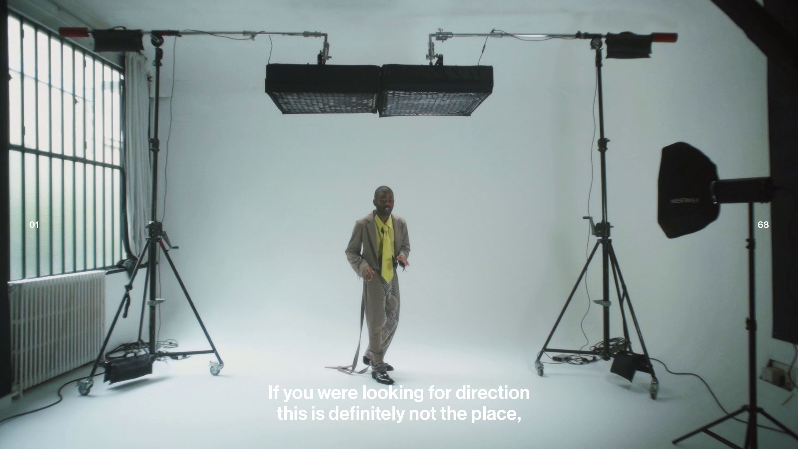 La pratica creativa di Kouagou, articolata tra arte visiva e performance e spesso abitata da un alter ego dell’artista, è attivata dal linguaggio. I testi elaborati dall’artista – apparentemente familiari, confusi e ironici al tempo stesso – sono origine e cuore pulsante di video, installazioni ed esibizioni dal vivo in cui affiorano, striscianti e potenti, l’instabilità del linguaggio, l’opacità delle parole e gli slittamenti di significato connaturati alla comunicazione mediatica e interpersonale.